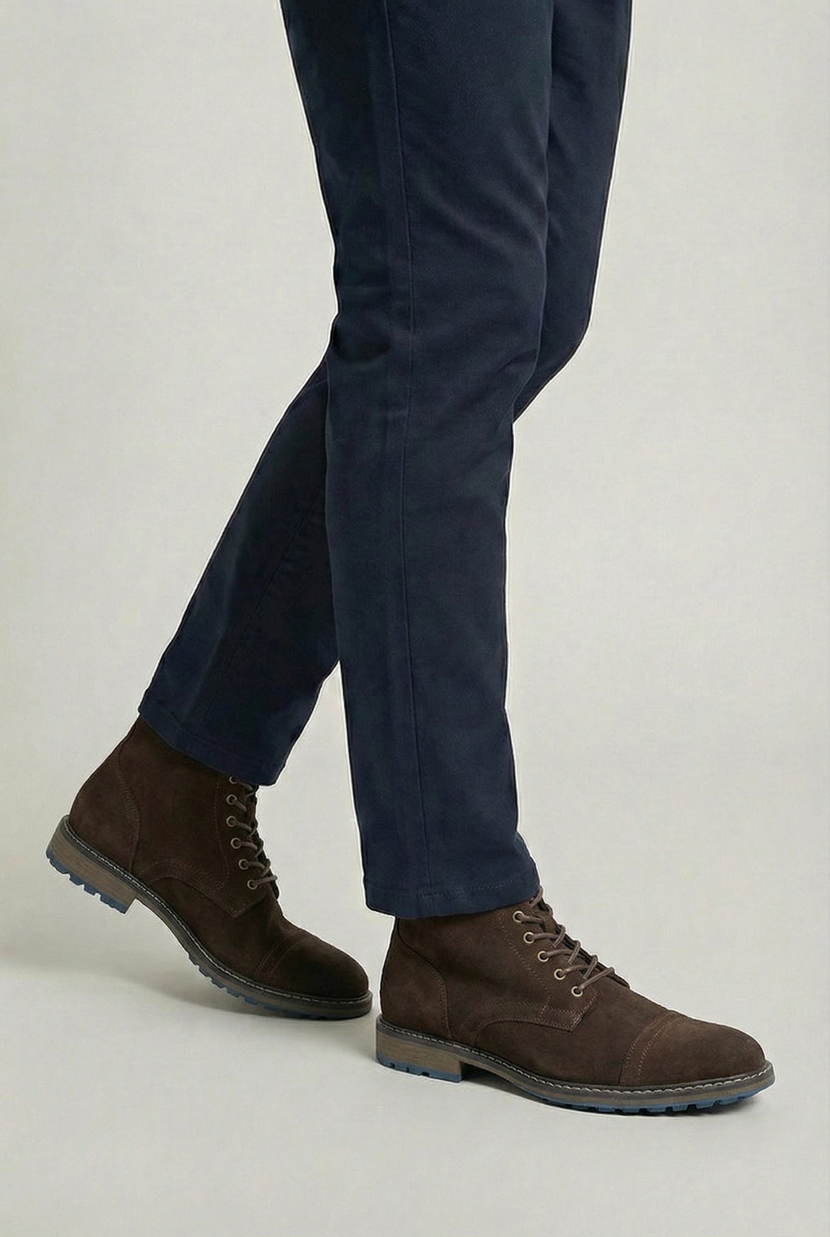 Both versions wear well with slim dark denim and a heavy knit or waxed jacket. The suede with blue sole leans into casual and weekend dressing; the grained leather carries more easily into smart-casual territory with chinos and a structured overshirt.